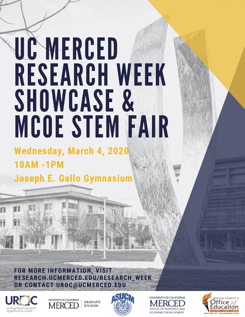 All UC Merced students (undergraduate and graduate students) are encouraged to participate in the Research Week Showcase to present their research conducted at the institution to the broader campus and local community. All of campus is invited to view posters and hear students’ presentations. In addition to campus presenters, Merced County Office of Education is collaborating to bring local students from Merced County schools to showcase their science fair projects.