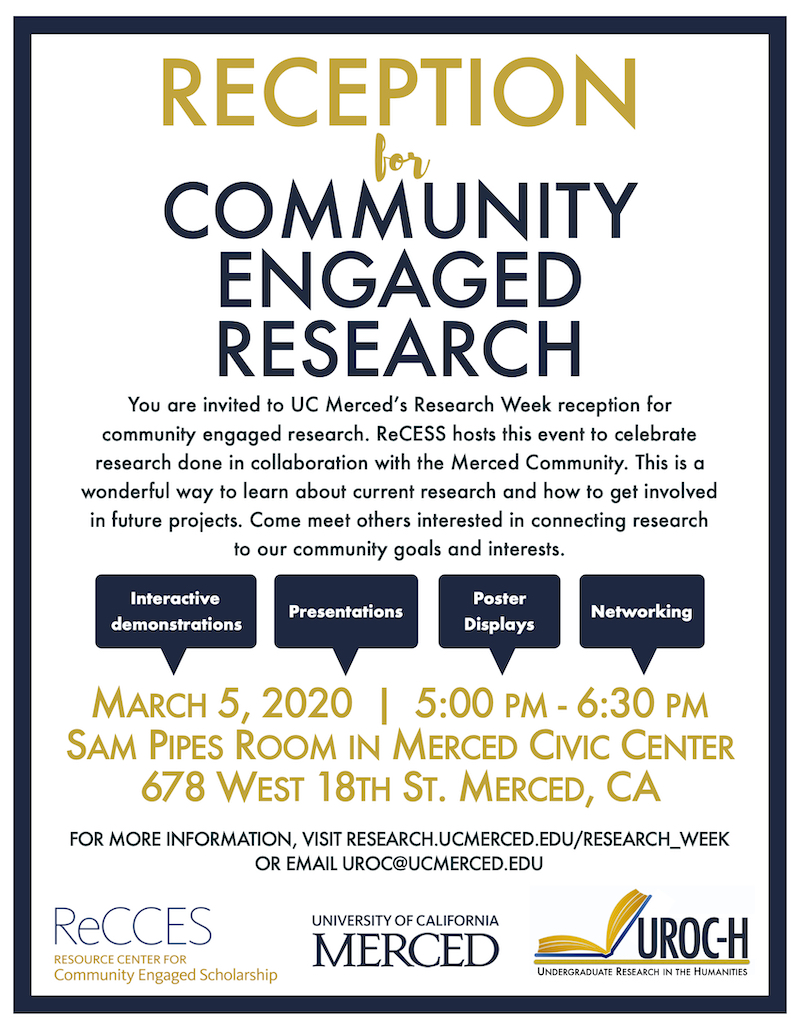 You are invited to UC Merced’s Research Week reception for community engaged research. ReCESS hosts this event to celebrate research done in collaboration with the Merced Community. This is a wonderful way to learn about current research and how to get involved in future projects. Come meet others interested in connecting research to our community goals and interests.