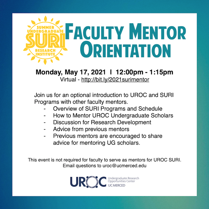 Previous faculty mentors are encouraged to share advice with others. Additional information is available on our website under the faculty tab https://uroc.ucmerced.edu/faculty